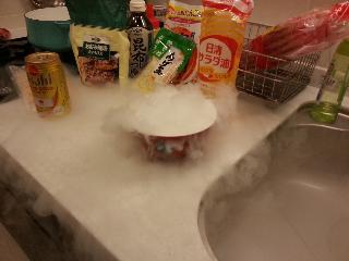 I mat affärer i Japan på sommaren, så packar de ned is tillsammans med dina frystå varor. Det roliga är att det är torr is, så när man kommer hem kan man göra som på bilden nedan.