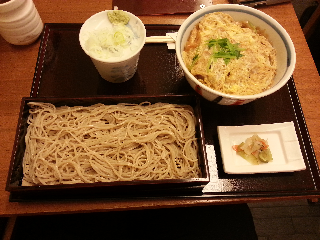 Åt en väldigt god lunch idag. Tonkatsu med kall soba nudlar. Tonkatsu är friterat fläskkött som skivas och läggs på en bädd av ris. Till det kalla vetenudlar som doppas i en väldigt god sås.